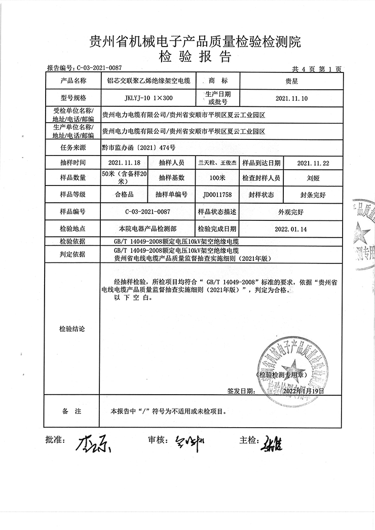 鋁芯交聯(lián)聚乙烯絕緣架空電纜 檢驗(yàn)報(bào)告